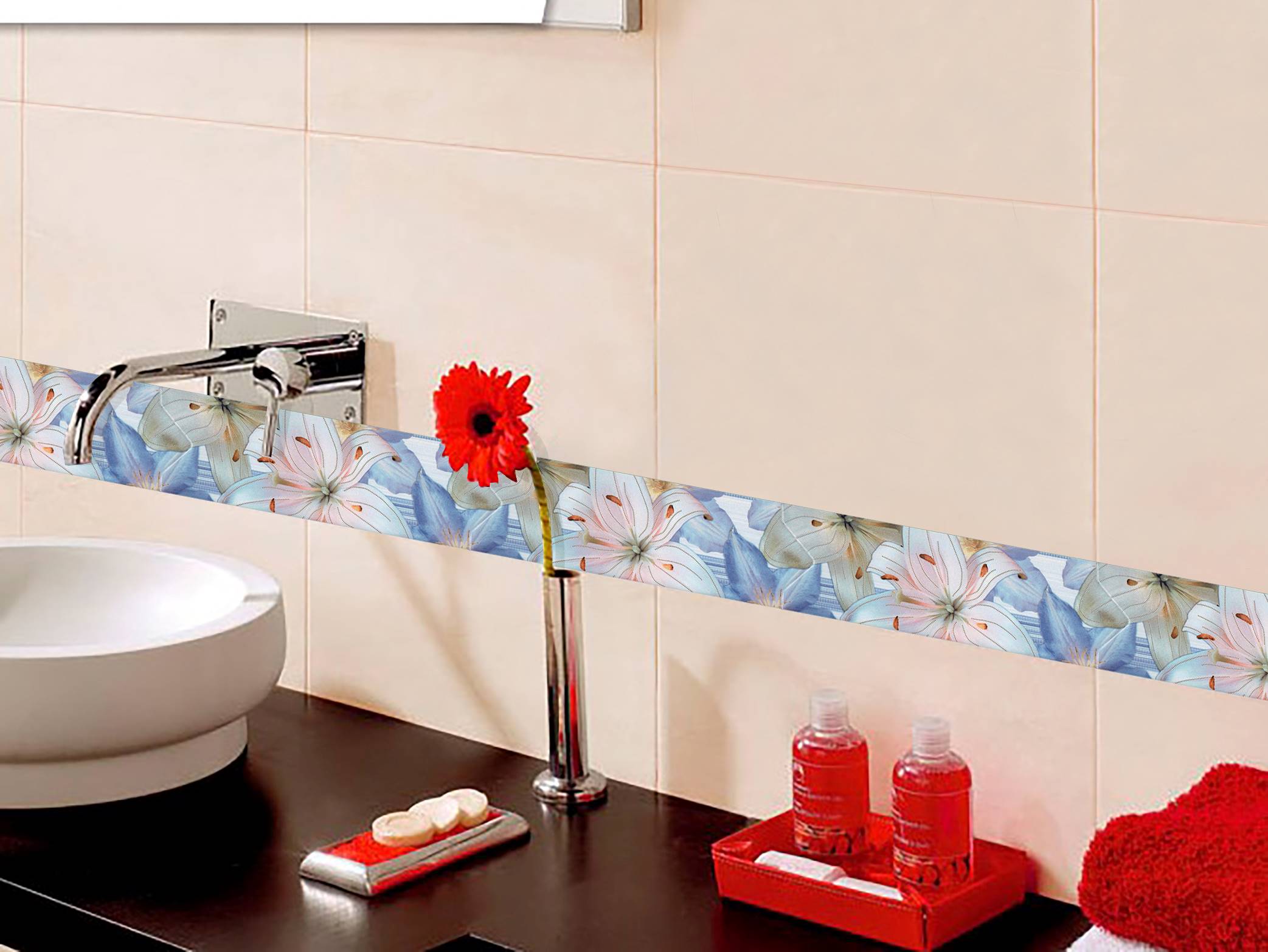 Cenefa con diseño en flores de distintos colores. Esta original cenefa es especial para la decoración de los espacios interiores del hogar o negocio.